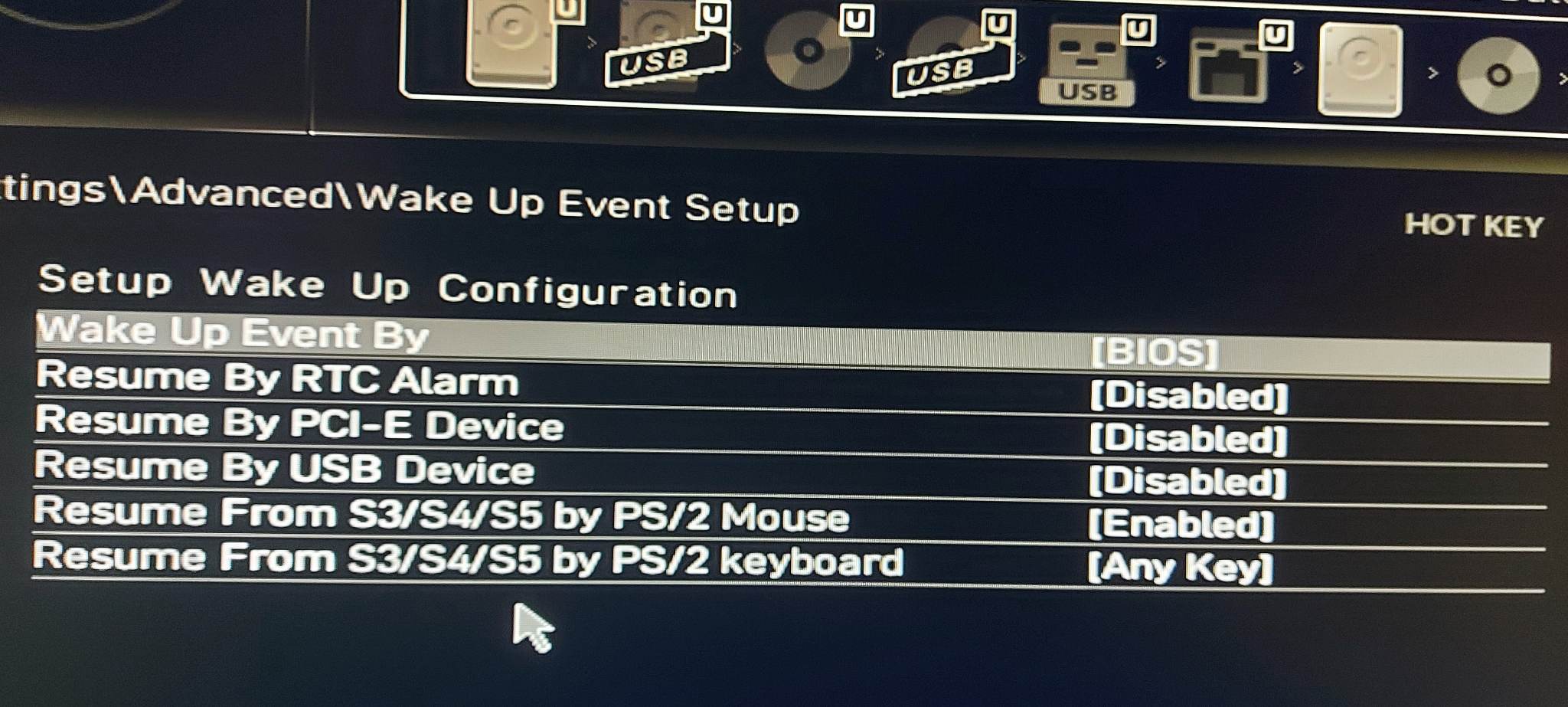 To, co jsi zapnul zase vypni a zkus přepnout na Enable položku "Resume By USB device".