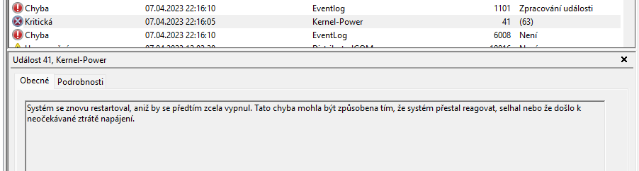 No vsak prave - pocitac se vypina nebo tuhne. V event logu error 41 ve stejnou chvili.