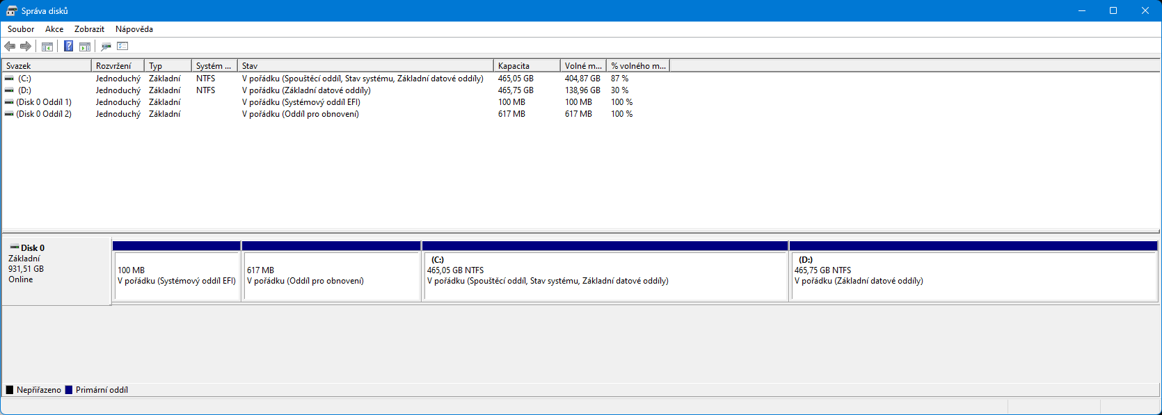 Sprava disku by mela ukazovat popis "oddil pro obnoveni".