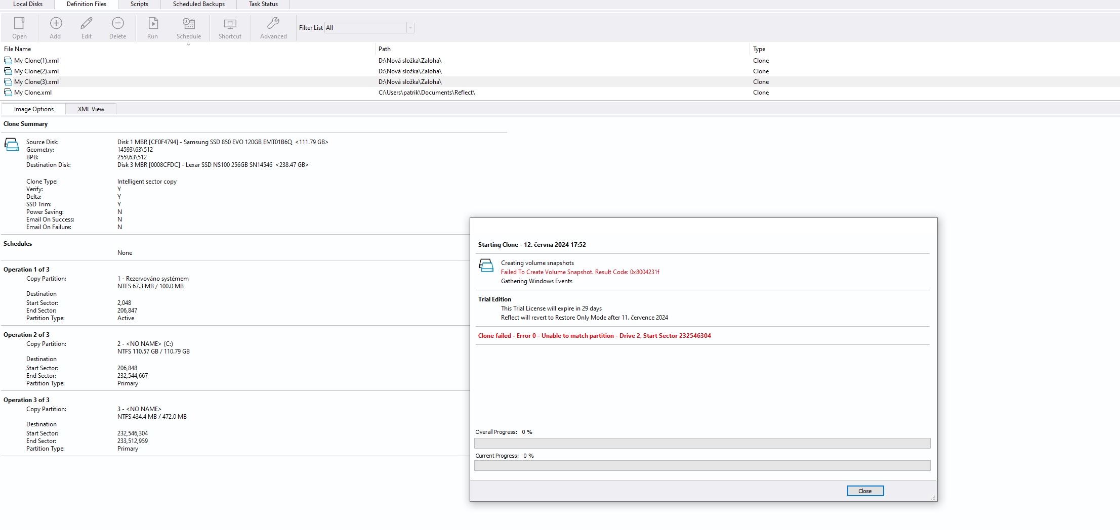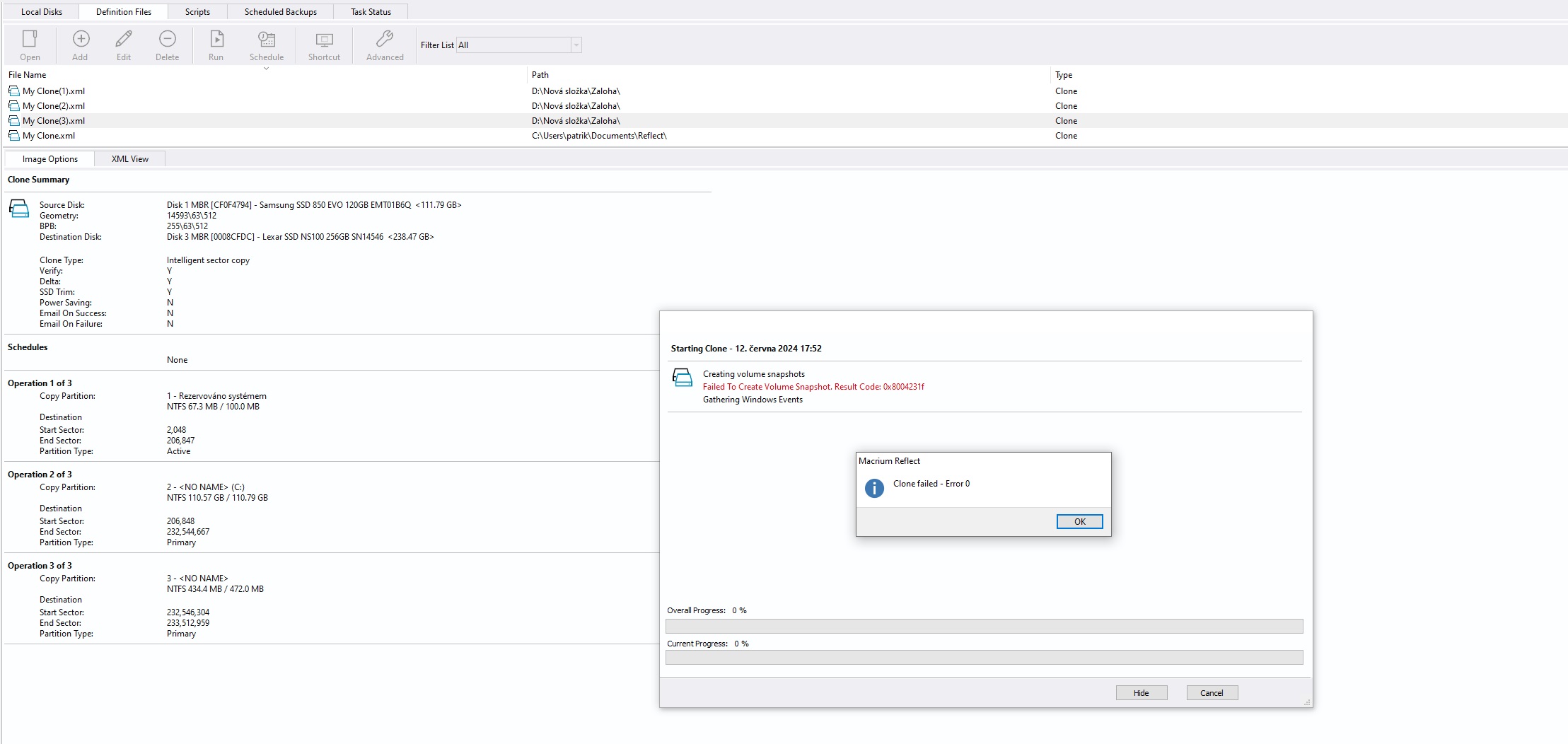Dobrý večer, klonoval jsem disk v Macrium reflect. Vše šlo v pořádku, ale v 50% mi to hodilo Error 9, tak jsem to zkusil znova a teď když vyberu co kam chci klonovat, tak po odkliknutí, kdy se začne klonovat tak mi to okamžitě hodí tuto chybu. Nevíte čím by to mohlo být? A je problém? Děkuji
