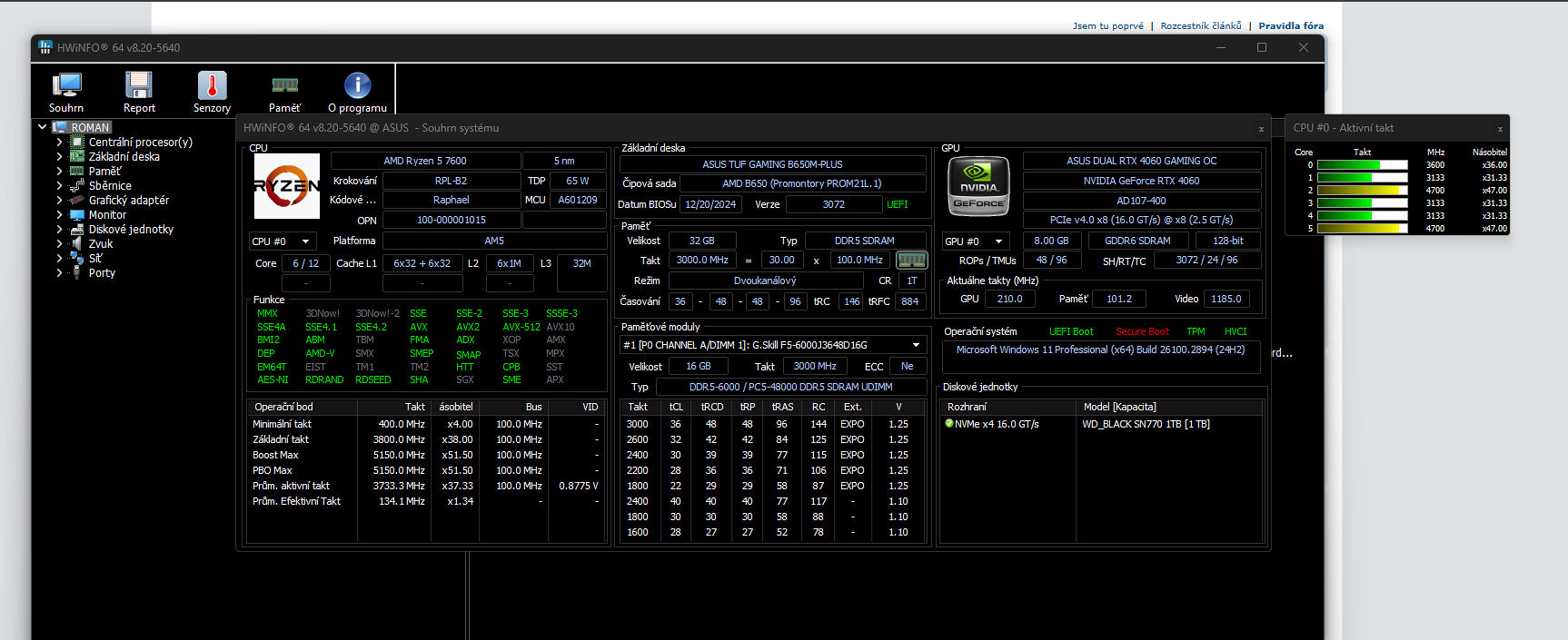 OS Windows 11 Professional (x64) (24H2) / MB ASUS TUF GAMING B650M-PLUS / CPU AMD Ryzen 5 7600/ RAM G.SKILL 32GB KIT DDR5 6000MT/s CL36 AMD EXPO / GPU ASUS DUAL RTX 4060 GAMING OC /