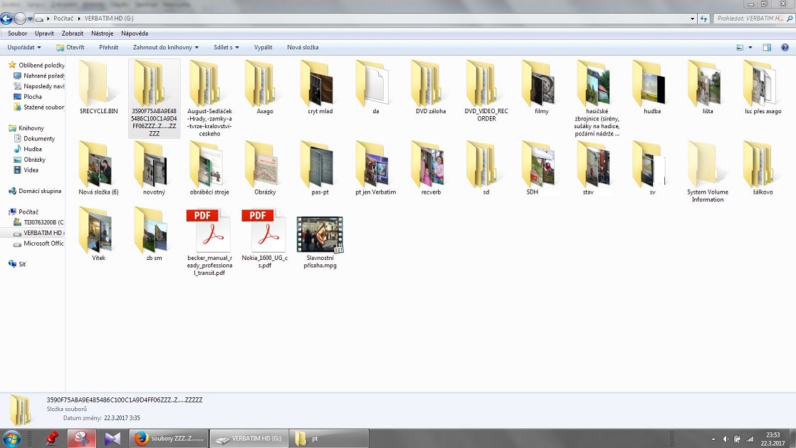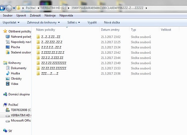 Složka s názvem 3590F75ABA9E485486C100C1A9D4FF06ZZZ..Z.....ZZZZZ je prázdná (vlastnosti- velikost 0), po jejím otevření se zobrazí 8 složek, které když se pokusím otevřít, tak neodpovídají.