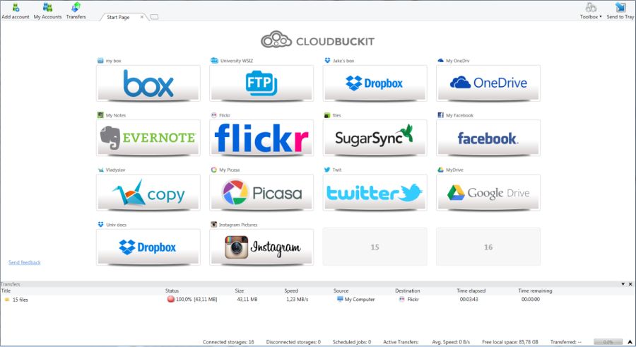 CloudBuckIt – Multiple Cloud Account Manager. The best cloud management tool to control your favorite storages. Map storage drive into windows explorer, Backup, Migrate, Schedule, Synchronize files, Fast Search and Accessibility in all Storage Accounts and photo services. Open, download, upload and transfer files, share files with colleagues and friends.