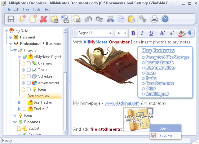 AllMyNotes Organizer je univerzální PIM aplikace (personal information manager) pro přehlednou správu úkolů, poznámek, myšlenek a dalších záznamů. Všechny záznamy lze přehledně třídit a k dispozici je možnost ochrany poznámek šifrováním a rychlé vyhledávání. Program je k dispozici i v portable variantě bez potřeby instalace.