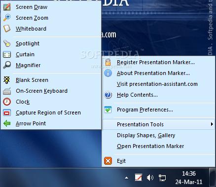 Prezentace Marker umožňuje uživatelům označit přímo na obrazovce a přiblížit určité části pro rychlé vysvětlení. Kromě toho nabízí další nástroje - světla, opona, displej Digitální hodiny, Arrow Point, Zvětšení, Screen Capture atd.