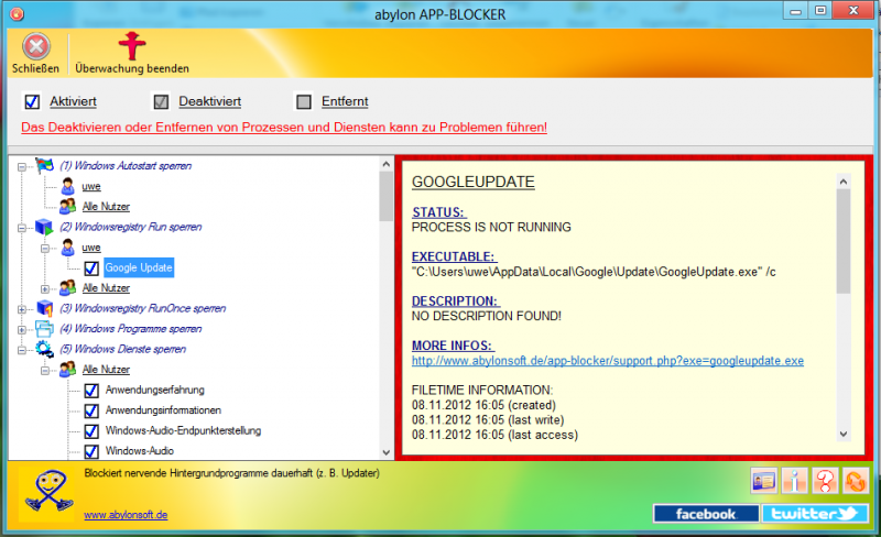 Po spuštění systému Windows běží mnoho aplikací (Apps) automaticky. Většinu času tyto procesy nejsou pro uživatele viditelné. Mnoho aplikací je monitorování počítače, kontrolu aktualizací nebo jiné pravidelné úkoly. Každá aplikace vyžaduje část výpočetního výkonu, paměti a zpomaluje počítač. Abylon APP-blokátor software zobrazuje všechny aplikace, jasně jako položky v nabídce spuštění a registru, jakož i všech běžících služeb a procesů. Jedno kliknutí a stačí zakázat nebo odebrat aplikaci ze startu trvale.