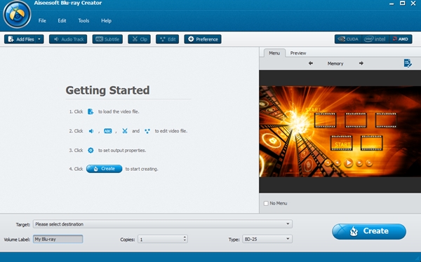 Blu-ray Creator je jedním z nejlepších Blu-ray software. To může vypálit jakékoliv video soubory na Blu-ray Disc (BD 25 a BD 50), Blu-ray složky a Blu-ray ISO soubor. Uživatelé mohou snadno přizpůsobit zvukovou stopu, titulky (SRT, SSA a formát ASS) sami. Chcete-li urychlit převod, Aiseesoft poskytuje Intel, CUDA a AMD tři metody zrychlení. Takže nemusíte se starat o čas.