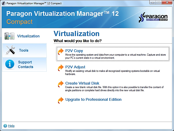 Paragon Virtualization Manager Compact slouží k vytváření virtualizovaných kopií počítačů s operačními systémy Windows 2000, XP, Vista a 7. Díky této funkci se aplikace hodí například na uchování kompletní, plně funkční zálohy celého obsahu počítače před instalací nového operačního systému (například Windows