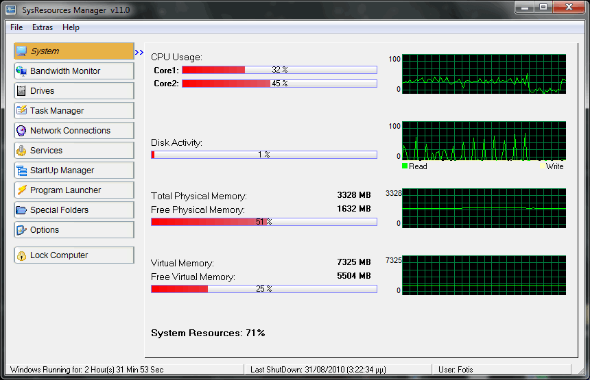 SysResources Manager je systémový nástroj pro sledování aktuálního stavu systému, jako je využití procesoru, paměti RAM a virtuální paměti dostupnost, disky, procesy, monitoring sítě (procesy přístup k internetu, síťového provozu / Speed), Služby, spouštění programů. SysResources Manager mohou optimalizovat výkon systému defraging fyzické paměti systému.