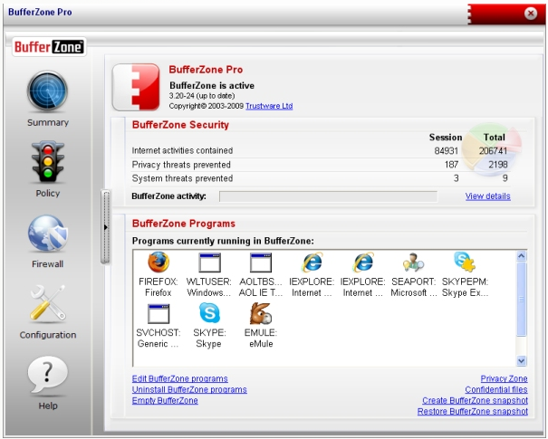 BufferZone od Trustware využíva virtualizačnú technológiu na vytvorenie bezpečného prostredia web-surfovania v ktorom akýkoľvek pokus zmeniť obsah vášho počítača je len simulovaný a nemá vlastne žiadne trvalé následky. Pokiaľ si nechcene stiahnete vírus, napríklad, a ten sa pokúša upraviť register alebo skopírovať sám na pevný disk, vírus si bude myslieť, že tieto činnosti sa podarili. V skutočnosti, žiadne zmeny registra neboli vykonané a žiadne súbory neboli vytvorené.