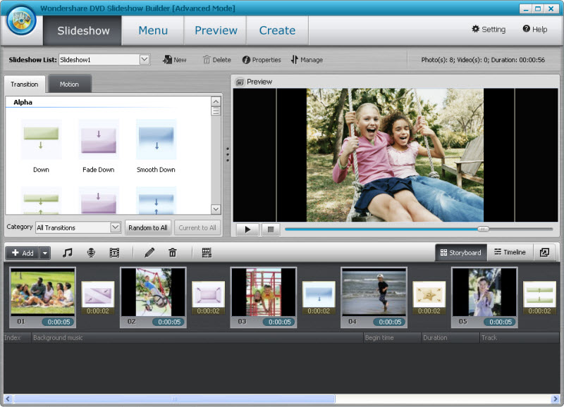 Wondershare DVD Slideshow Builder Standard snadno promění vaše statické fotografie v ohromující fotografický film. Snadné vytváření filmů s automatickým přecodem, takže si můžete vytvořit fotomontáž - film. Sbírejte své oblíbené fotografie a znovu prožïjte všechny vzpomínky a sdílejte je na TV, PC, YouTube / Facebook a všech druzích zařízení.