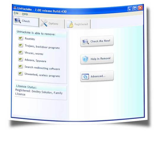 Hlavní rozdíl mezi UnHackMe a jiné AntiRootkit software je jeho metoda detekce. Precizní dvojité kontroly pro Windows na bázi PC, což umožní identifikaci a odstranit všechny druhy škodlivého softwaru. Okamžité sledování škodlivého kódu v systému.