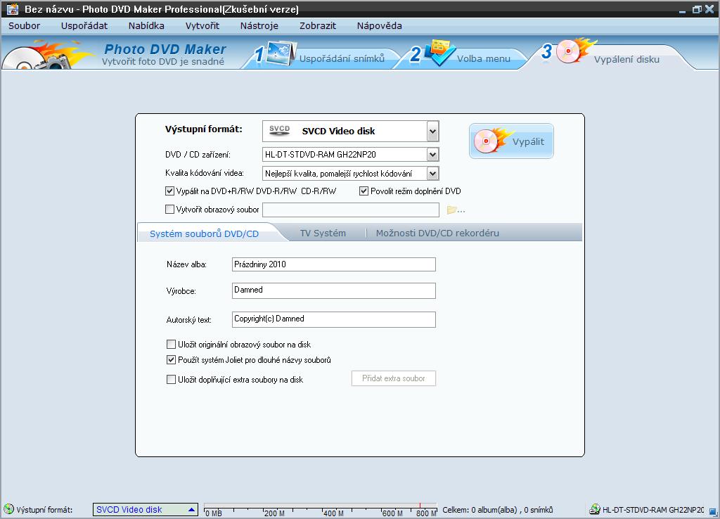 Moc prosím o radu. Já jsem si tento program stáhla včera ale když chci vypálit na DVD prezentaci z fotek, tak mi to píše, že není vložen žádný disk i když v mechanice je, tak už nevím co s tím... Zkoušela jsem dělat prezentaci v Nero Vision a úplně v pohodě se mi to podařilo vypálit na to samé DVD u kterého mi to v DVD photo maker nejde..