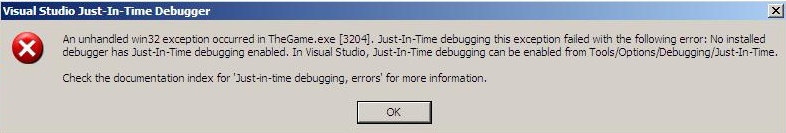 Hru nic neblokuje, hra proste spadla a ta hlaska znamena pouze to, ze nelze spustit zadny debugger ktery by ti tu chybu zobrazil.