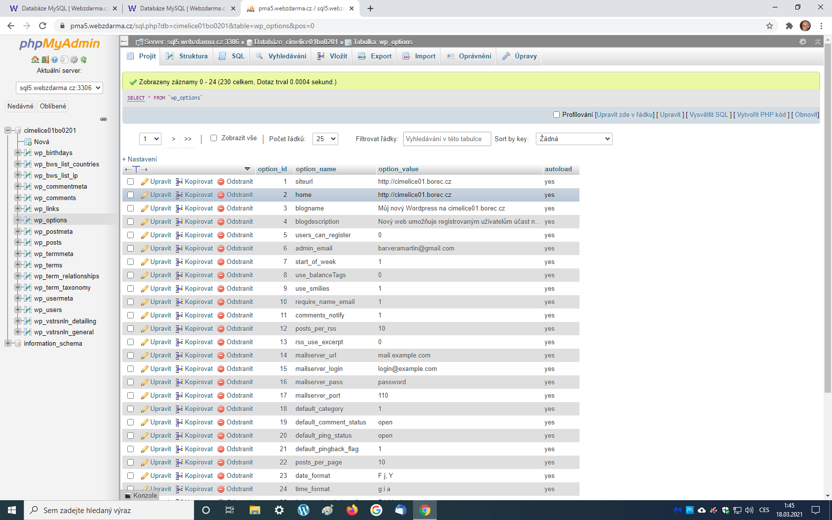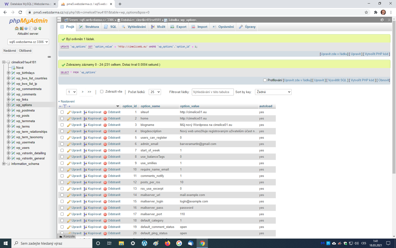 Chci proto to přesměrování odstranit. Dočetl jsem se, že toho lze dosáhnout úpravou URL ve wp-option v databázi webu.