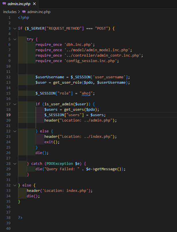 2) Nastavuješ "role" do session až v souboru admin.inc.php, ale do toho se redirectuješ z toho druhýho souboru, kde už chceš použít tu "role" v podmínce, kterou nemáš ještě teoreticky nastavenou.