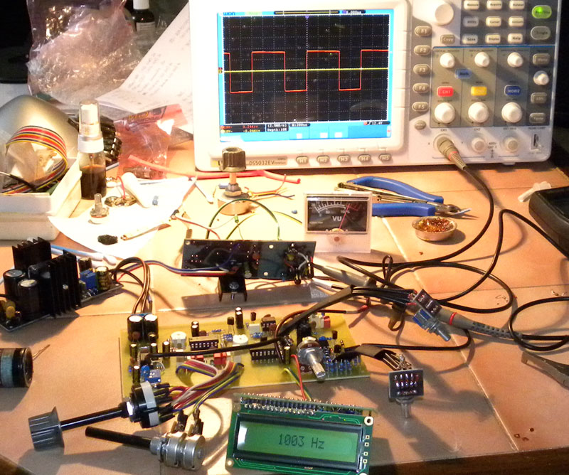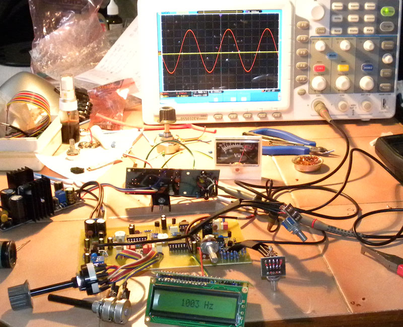 A pak tohle všechno dát do nějaké krabice. Tuhle konstrukci jsem volil proto, že prvotním signálem, který se generuje je sinus. Funkční generátor nabízí např. i Flajzar (stavebnici), ale tam se sinus vyrábí z pily a to vždy znamená větší zkreslení.