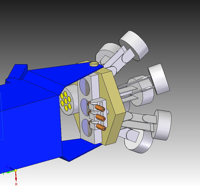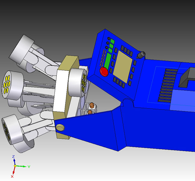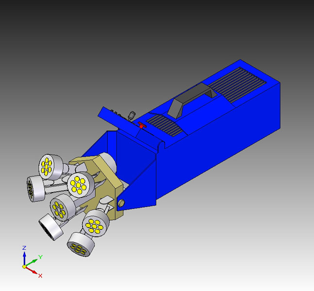 Nová svítilna se dvěma modelářskými aku a síťovým zdrojem bude mít asi 15kg. Bude ji možné provozovat i na jeden aku a to pak hmotnost klesne na cca 10kg. Světelný výkon by měl dosáhnout jako 10kW halogen. Motoricky pohyblivá ramena s bloky s led umožní změnu kužele a z toho důvodu (aby ramena nebyla příliš těžká - na chlazení s ventilátorem mě vycházel 2kg/chladič) chci použít vodní chlazení. Díky natáčecím ramenům bude moct svítilna svítit v úhlu 9 až 280st. Primitivní animace pohybu ramen a natáčení nosné desky (svítilnu při takové váze nikdo naklopenou např. při svícení do korun stromů dlouho neudrží) najdete zde. Na zadní straně otočné desky, jenž se umí otočit o 180st bude další bonusové vybavení. Ovládání bude 7" dotykovým displejem a časem plánuju i dálkové ovládání. Bylo by jednodušší popsat, co neumí, což co by měla umět.