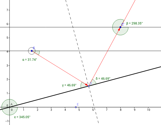 Mám objekt letící z bodu C pod úhlem α k bodu D, kde se odrazí od stěny a letí k bodu C'. Já bych potřeboval vypočítat úhel β, pokud znám úhel α a úhel ε. Úhel měřím vždy doleva ve směru pohybu a k vodorovné přímce.