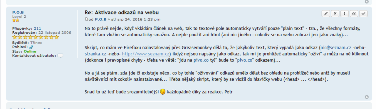 Ještě i obrazem - v mém příspěvku přesně, jak jsem psal - vše, co může být odkaz, vidím jako odkaz a klikám + jsou odkazy formátovány jako ostatní reálné odkazy na stránce, takže já vlastně ani nepoznám, zda ten odkaz tam někdo vepsal nebo to byl jen čistý text - prostě mám všude odkazy a toho bych chtěl dosáhnout přímo, tedy aby to uměl už sám web, nikoliv až doinstalací doplňků atp...