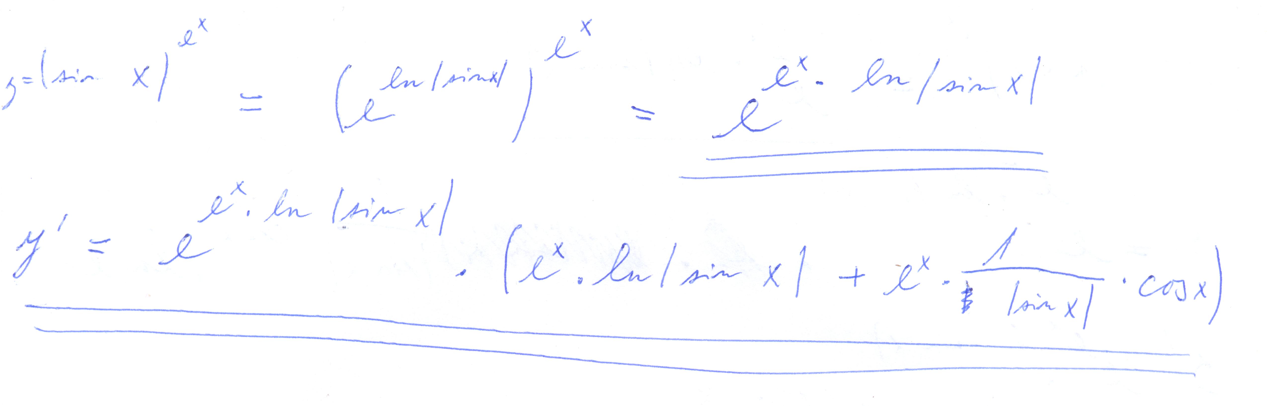 Takže oprava, trochu jsem o tom přemýšlel a radil se a nakonec jsem došel k závěru, že od e^x nejde jednoduše odečíst 1.Celý výraz se musí převést na mocninu e a pak teprve zderivovat.Podle mě se pak dá aplikovat pravidlo pro derivaci-nejdříve zderivovat základ (který se v tomto případě nemění) a pak zderivovat exponent jako složenou funkci. :D