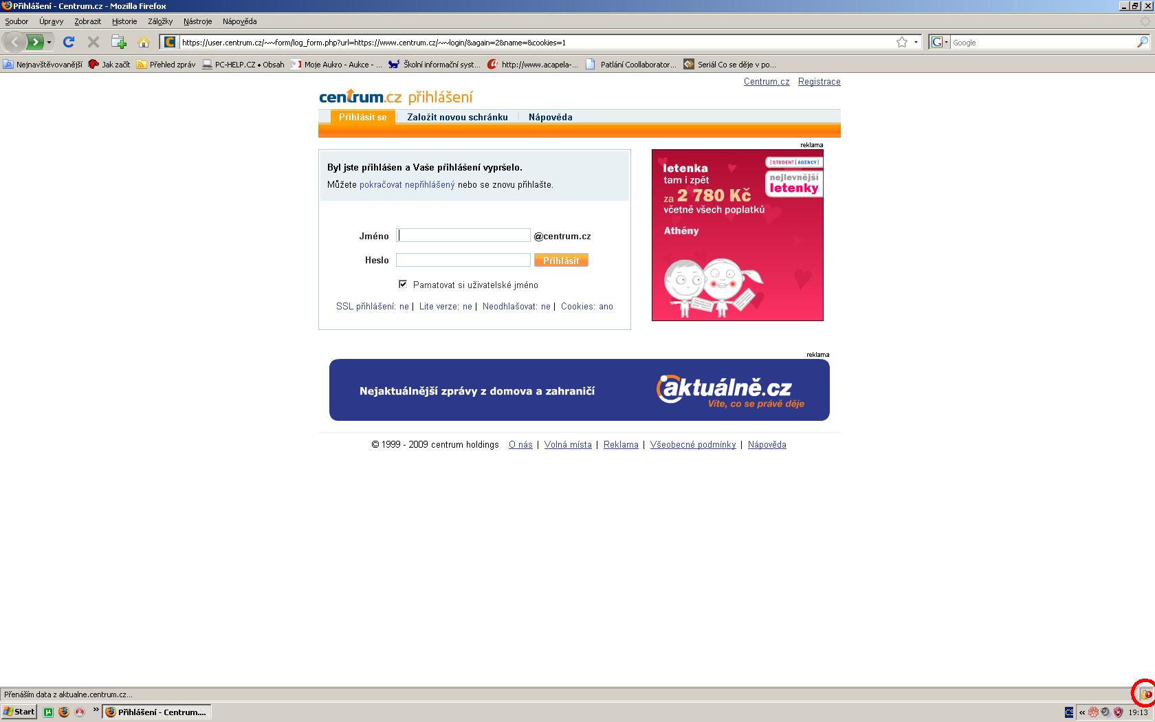 Zdravím. Stala se mi taková divná věc. Před chvílí jsem zapnul počítač a spustil jsem prohlížeč Mozilla. Místo domovské stránky Centrum.cz se mi zobrazilo následující. Dole jsem si všiml, že svítí výstraha a tak mě napadlo, zda se nejedná o nějaký phishing, kdy by po zadání e-mailu a hesla mohl někdo zneužít mojí e-mailovou schránku..
