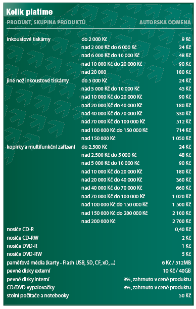 Nebudu už více rozebírat s čím vším nesouhlasím, ptž sem to již zmínil. Ale jen bych chtěl dodat něco málo k Tvé poznámce o 80% s DVD a CD. Možná, že většina lidí si tyto média kupuje právě proto, aby na ně později hodila něco nelegálně opatřeného, ale pořád je tu i část lidí, kteří si na takováto média vypalují fotky, své důležité dokumenty, apod. Tkž proč by i oni měli platit autorský poplatek? Nejen, že OSA na ně kouká jak zloděje, BSA je bere rovnou jako kriminálníky. Tomu se dle mého říká presumce viny. A to mi rozhodně není po srsti. Níže přikládám jeden obrázek ze září minulého roku jako představu, kolik platíme na autorských poplatcích. Kdybychom pak měli zmínit třeba hudebníky, kteří jim musí taktéž platit, mohli bychom tu být do večera. Ptž je naprosto jedno, jestli s tím ten či onen hudebník souhlasí, stejně mu nic jiného než zaplatit nezbude. A pak se člověk nemůže divit, že po odvodu těchto dávek, někteří ne tolik slavní, žijí jen z toho, co si vydělají na koncertech. Ale to je zase kapitola sama pro sebe, jen sem chtěl říct, že každý by měl mít možnost volby.