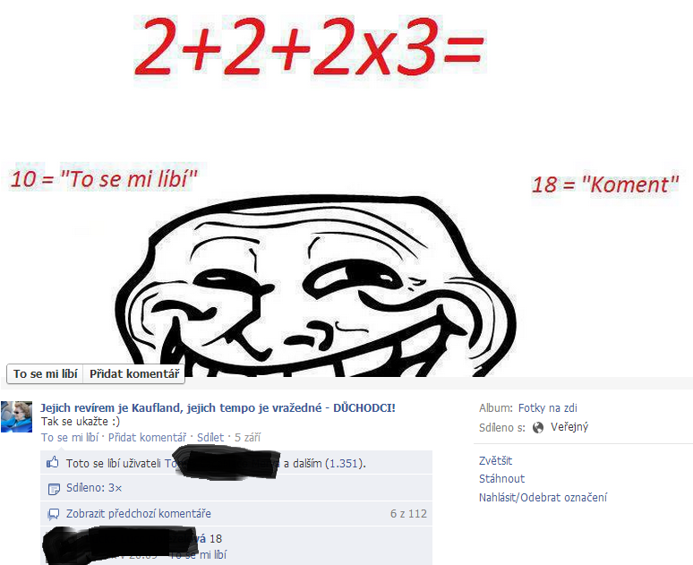 Oni věděj jak na ně, a neprohoděj to tak, že by jednička byla pod tlačítkem Sdílet, protože na dvojku bude reagovat víc lidí, tím pádem bude víc sdílení a roznese se to mezi víc lidí. A pod to ještě další lolkové budou psát "Co to je za kravinu, to je jasný že je to 2", napíšou to tam každejch třicet minut aby to každej viděl, a majitel tý stránky se pak raduje z toho jak na těch dementech vydělává peníze.