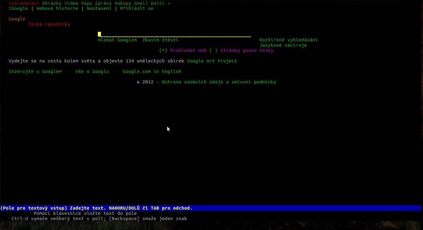 Se máte, samý ikonky a doplňky na plochu. Já jsem už línej se z terminálu přepnout na normání plochu. Dosáhlo to až tak daleko, že jsem si nainstaloval prohlížeč a komunikátor do terminálu, takže google vypadá níže. Má to ale jednu velkou výhodu. Nic mě nerozptyluje, žádné zbytečné prostředy