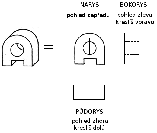 Je to jako bys to těleso měl položené na papíře a překlápěl ho na stranu, kde bude nakreslený další pohled, díváš se přitom vždy kolmo k papíru.