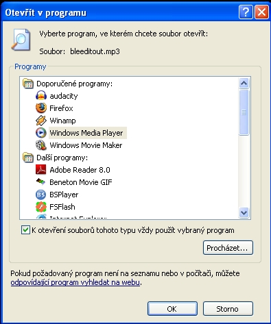 Start/Nastavení/Ovládací panely/Možnosti složky/karta Typy souborů. Tady jednotlivým typům souborů (jednotlivým příponám) přiřadíš program, ve kterém se má soubor otvírat.
