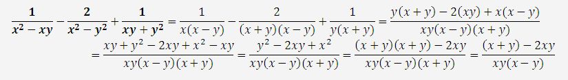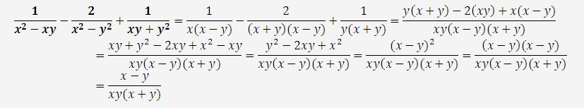 = 1/x(x-y) - 2/(x-y)(x+y) + 1/y(x+y) .. společnej jmenovatel dole bude x*y*(x-y)*(x+y) .. už to zvládneš?