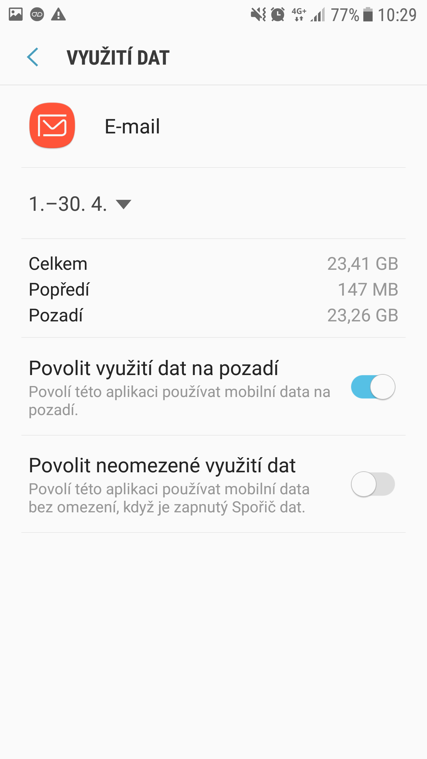 Víte prosím někdo, proč mi najednou aplikace E-mail začala na pozadí žrát tolik dat (viz přiložený obrázek)? Běžně si to bralo tak max 3GB což je taky sakra hodně, ale akceptoval jsem to. Ale 23GB je už dost přes čáru... :eh: