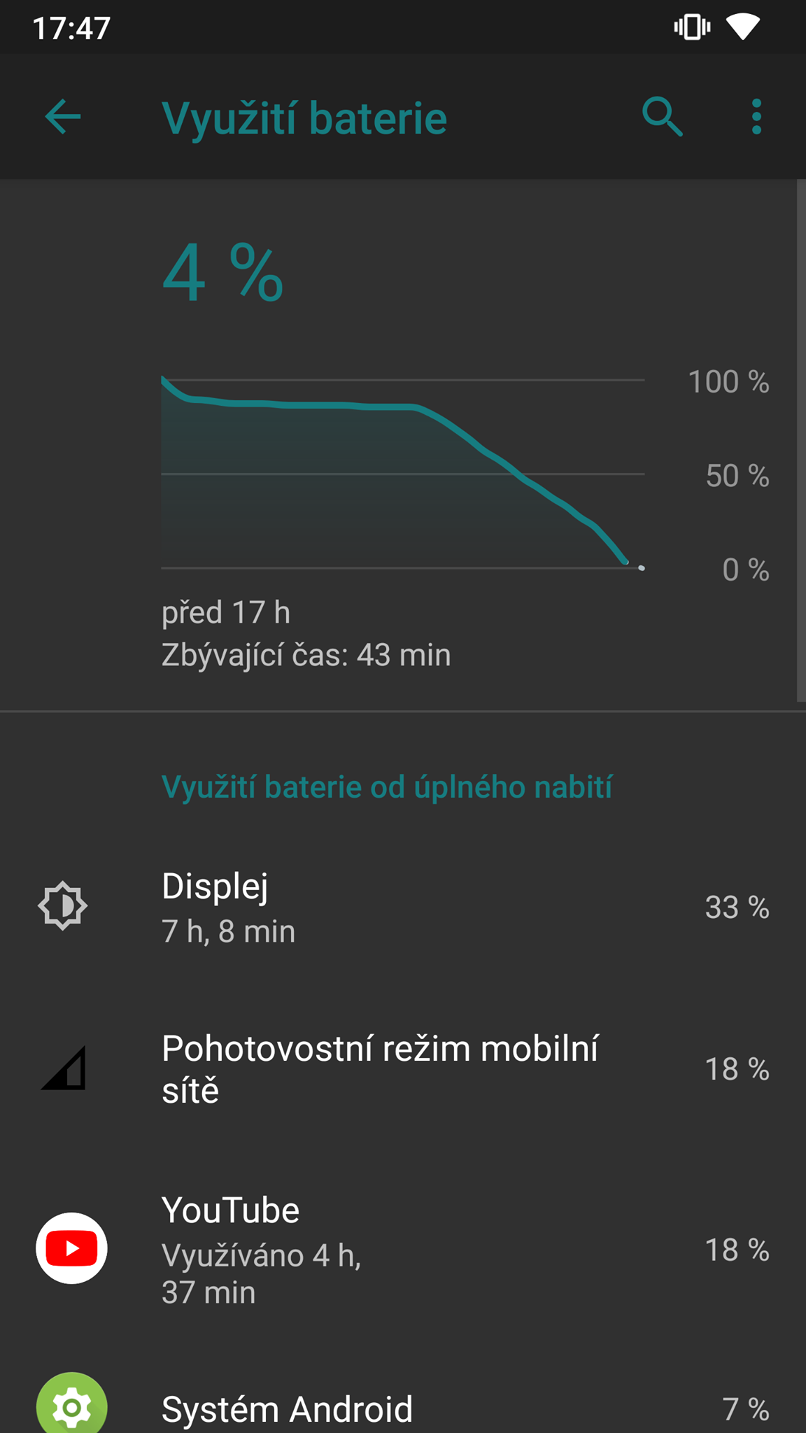 Tady mám graf baterie, kdy jsem testoval přehrávání pouze YT videa. Jas jsem měl zhruba na necelý půlce.