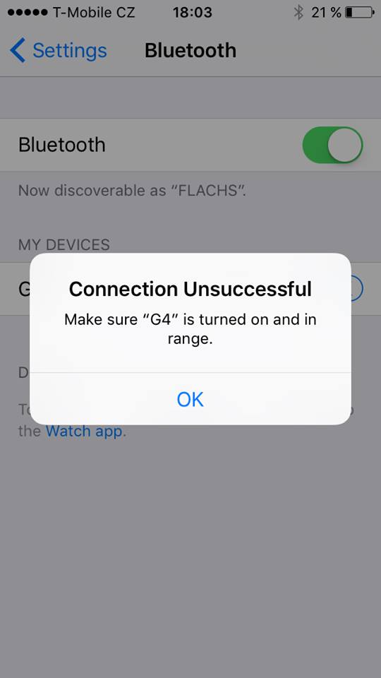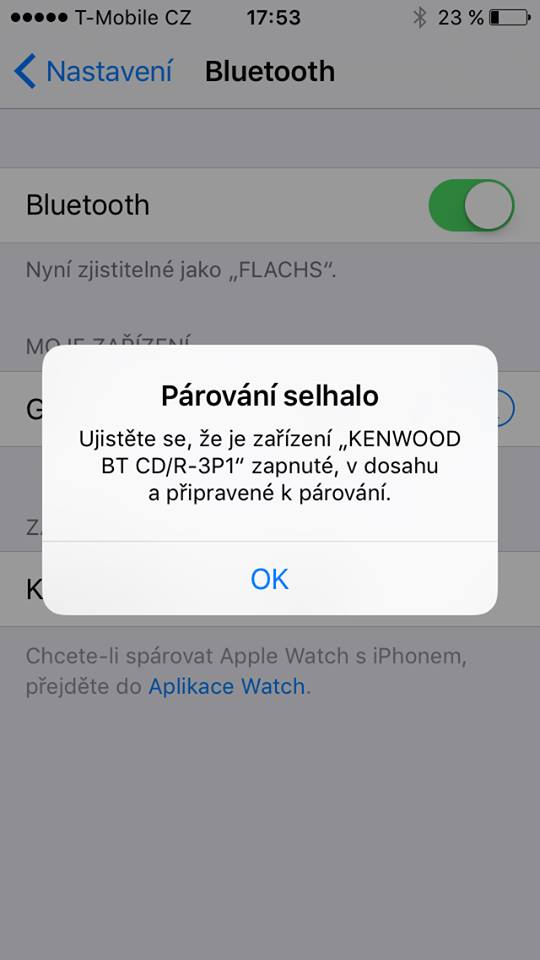 Zdravím nejde mi bluetooth na iphonu 5s 32gb když chcu spárovat tak nejde ani s autorádiem tak s jiným mobilem = chyba bude v mobilu viz foto