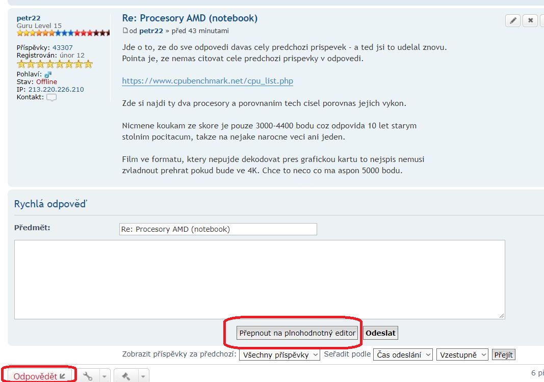 jinak řečeno příspěvek se píše po kliknutím na Přepnout na plnohodnotný editor, nebo na Odpovědět, případně psaním do editačního okna pod posledním příspěvkem.