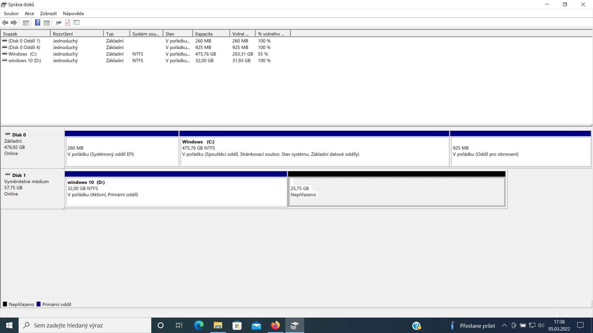 Polovina disku je vytvoreny oddil, polovina je prazdna, dohromady 64 GB.