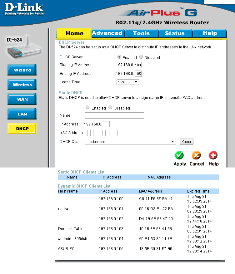 V běžném provozu se musí k routeru D-link DI-524 připojit LAN kabelem tato zařízení: 1x Stolní počítač, 1x Televize, 1x Tiskárna. Přes Wifi se k tomuto routeru chce připojujit několik mobilů (zhruba 5) a notebook (zhruba 2) popřípadě tablet.