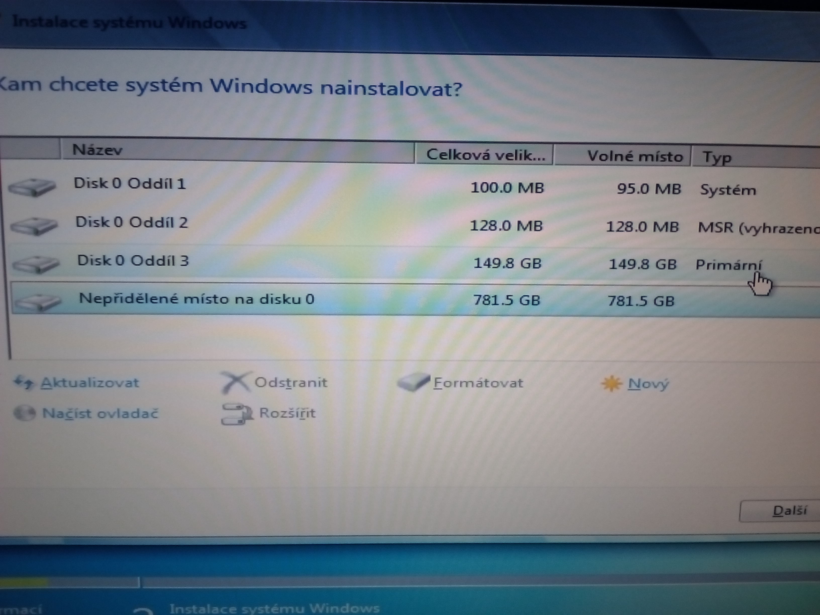 Kdyz se na to ted divam znova, pise to "Nepridelene misto na disku 0" a velikost je 781 GB