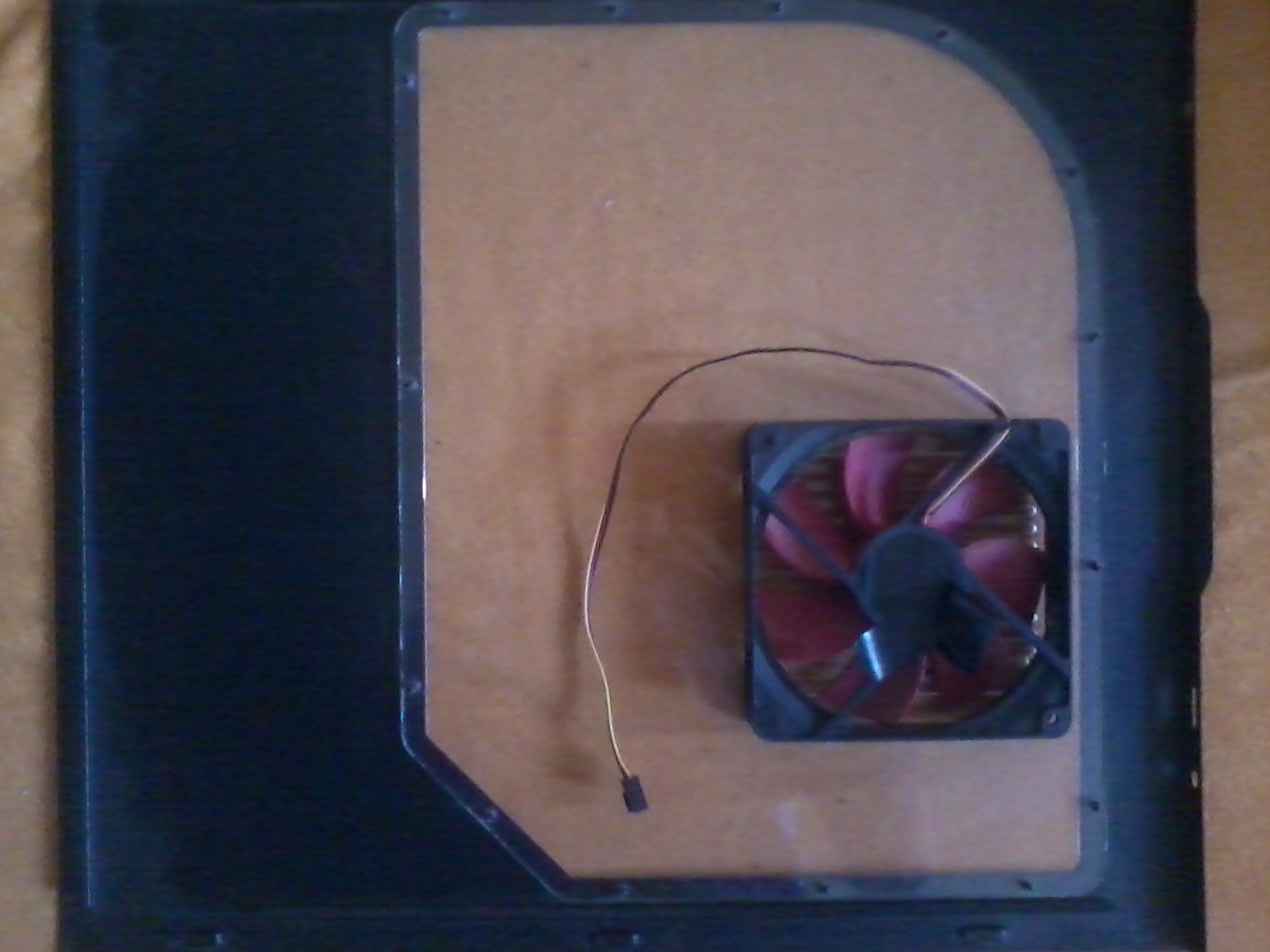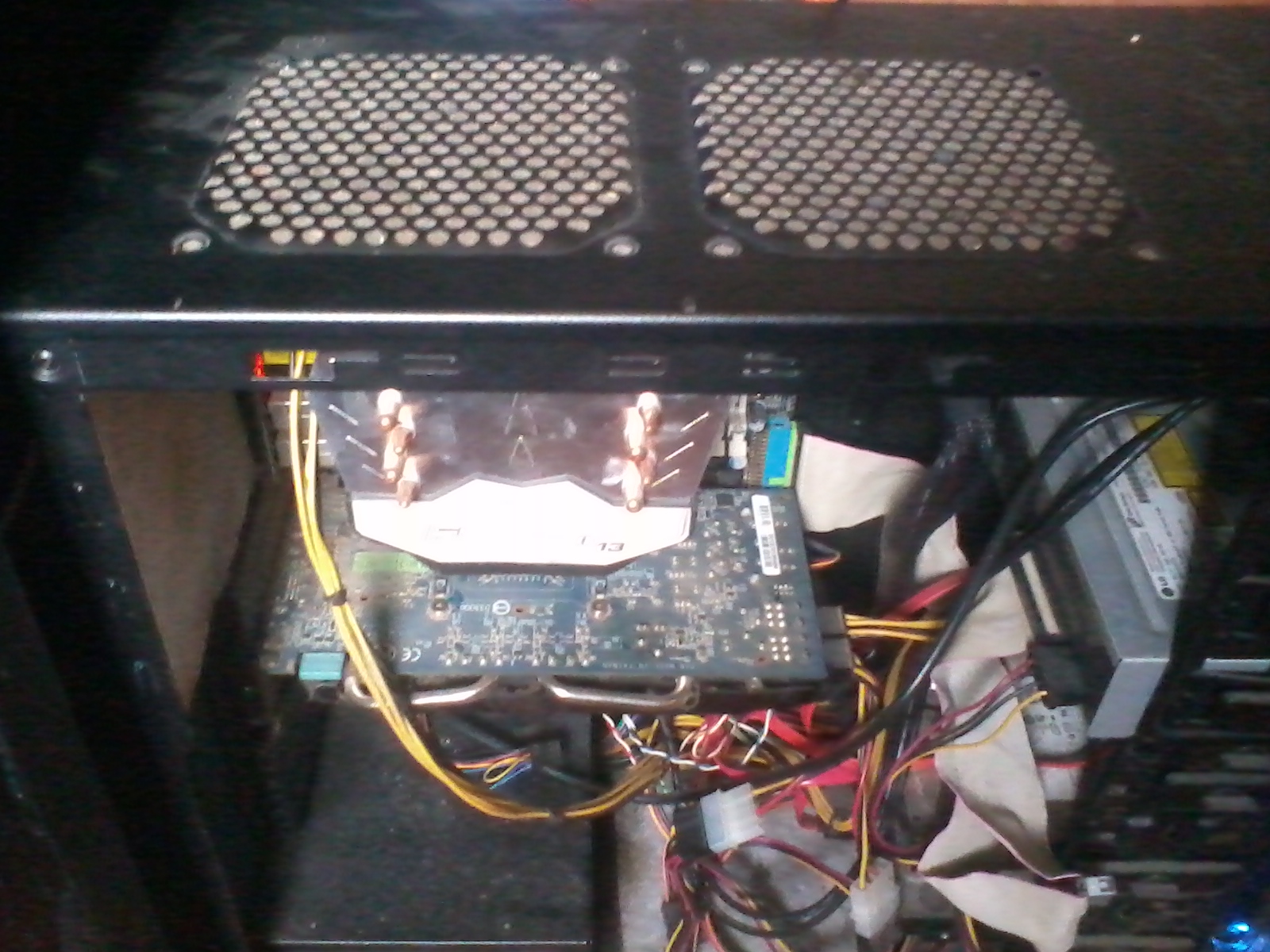 Mas tam dva ventilatory foukajici vzduch dovnitr, ale ZADNY ktery fouka vzduch ven. A jedine otvory kterymi muze vzduch unikat jsi ucpal tou bilou hmotou ktera bude asi prachovy filtr, ktery ale zcela blokuje tok vzduchu.
