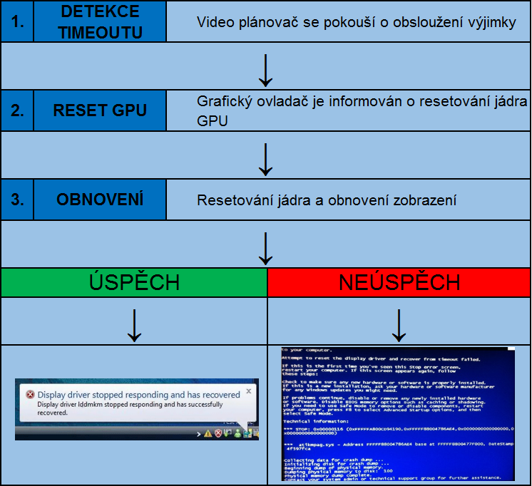 V některých případech se obnovení nezdaří, protože vlákno ovladače v bodu č. 2 vytuhne a dojde k jeho zavěšení. Systém tuto skutečnost vyhodnotí jako nemožnost obnovení ovladače a dojde k zastavení systému se STOP kódem 0x116 VIDEO_TDR_ERROR . Pokud k tomuto dochází, je nejlepší vložit příspěvek do BSOD sekce, kde se můžeme věnovat problému podrobněji.