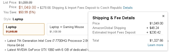 Čau, při projíždění a vybírání ntb jsem narazil na jeden ntb na Amazonu, samozřejmě jsem věděl, že to tam bude levnejší, ale nečekal jsem skoro o 6000 Kč. na Amazonu: https://www.amazon.com/gp/product/B06Y4 ... 0750e&th=1