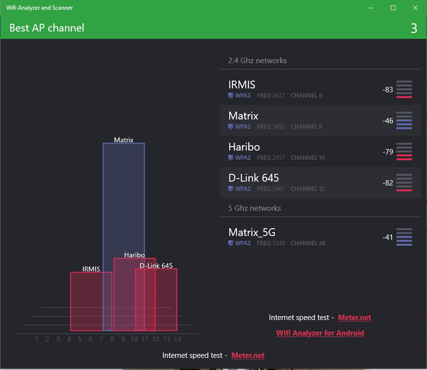Zkoušel jsem několik kanálů při 5 GHz připojení a stav je pořád stejný. Bydlím v bytovém domě o 3 patrech a sousední domy jsou 30m daleko. Nevěřím tomu, že by byly obsazené všechny kanály v 5 GHz pásmu.