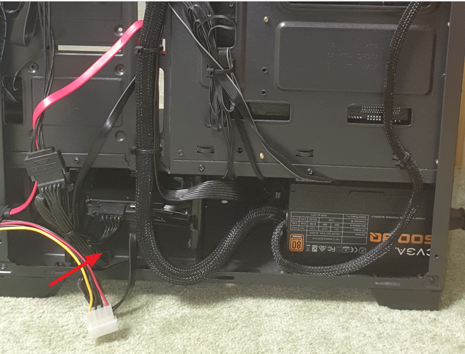 No vidíš, kabelů kopec. Na obráku máš šipkou označené sata napájení, je to zamotané, přestřihni tu platovou objímku, co z toho dělá klubko, ať si to rozmotáš. Bývají na jednom kabelu 3 SATA konektory, máš obsazené dva.