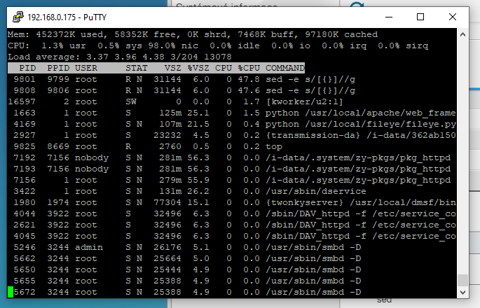 chtěl bych vás poprosit o radu ohledně svého NASu, ve kterým poslední měsíc běží proces "sed", který zatěžuje NAS na 100%. Zkoušel jsem restart, nepomohlo.