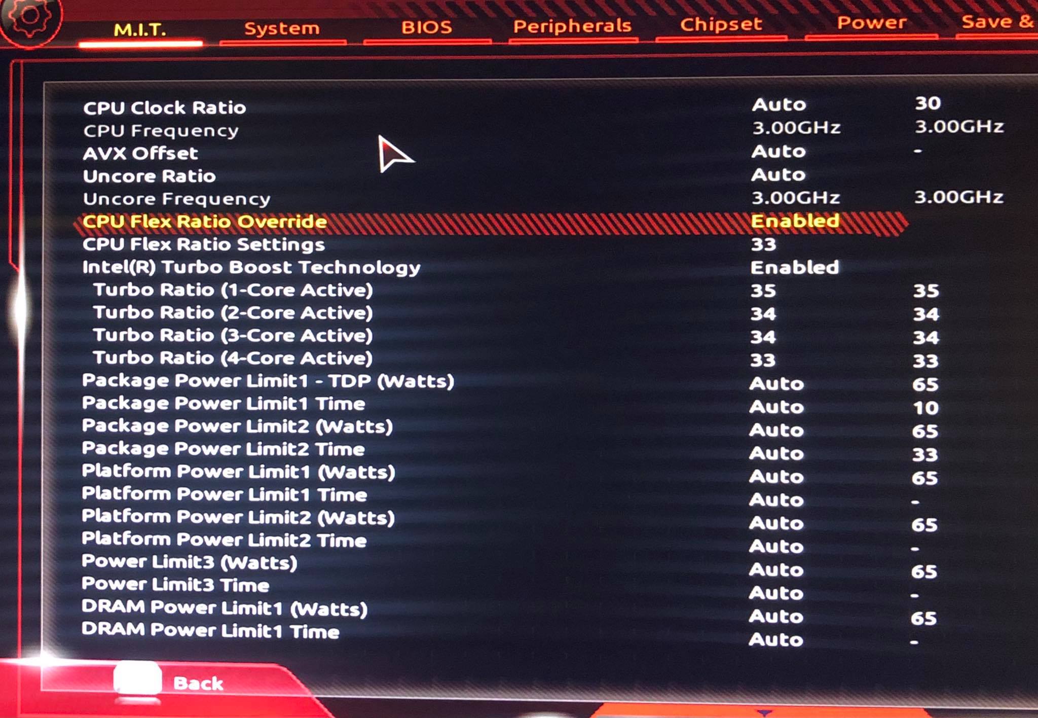 skus dát intel turbo boost technology na disabled a restartuj opět do biosu a skus zadat CPU Clock Ratio na 33.