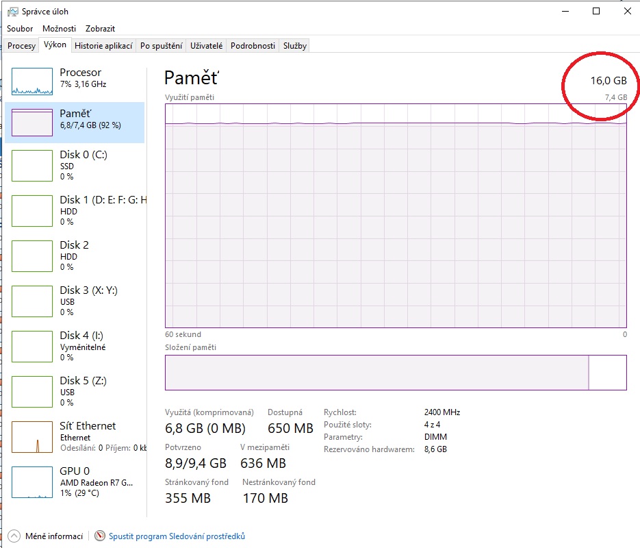 Ahoj, mám asi špatně využité Ramky. DDR4, 4 sloty a měl bych mít 16 GB. Ve správci úloh mi to ukazuje tohle: