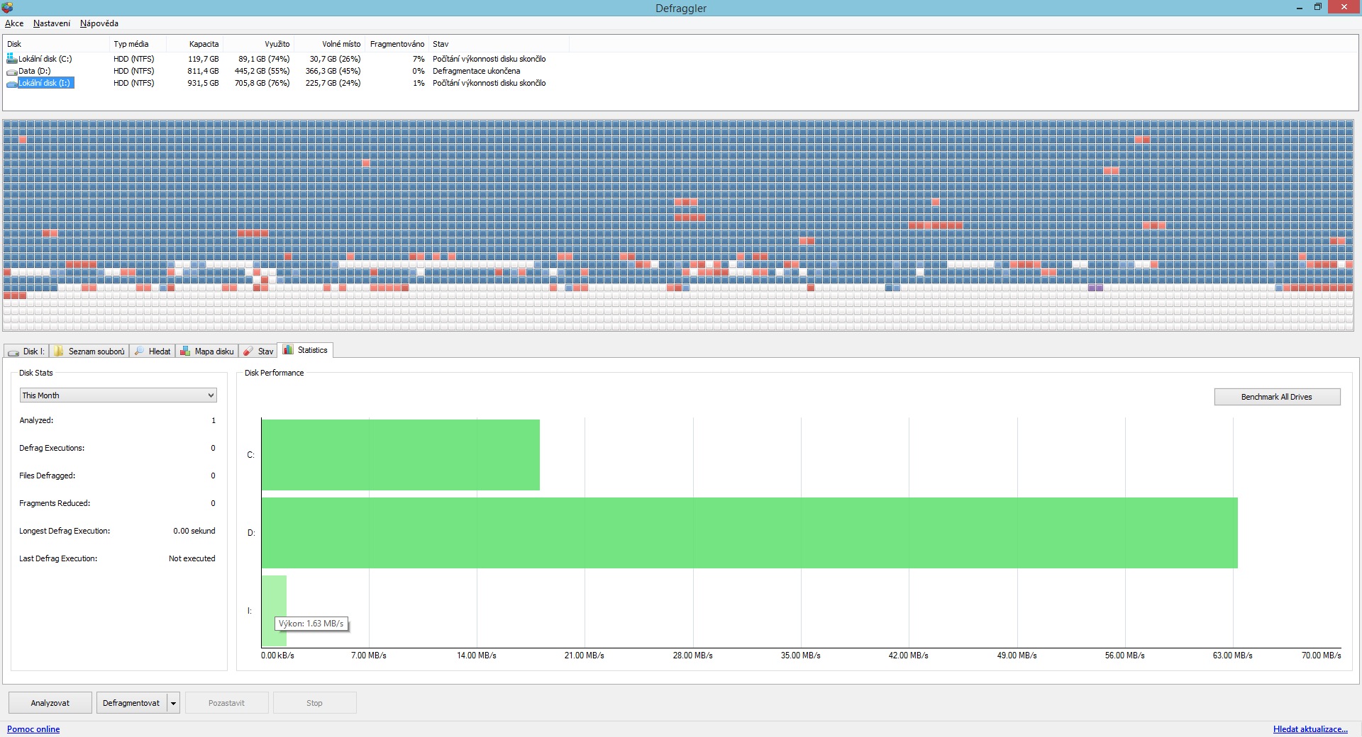 Hrozně pomalu čte, přitom jinak asi nejsou žádné chyby. Přikládám screenshoty z HD Tune a CrystalDiskInfo a Defraggleru.