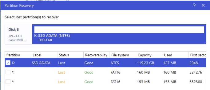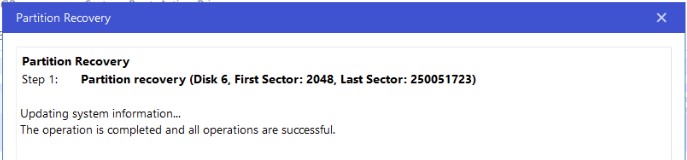Skúsil som to teda v tom programe EaseUS partition manager cez Partition recovery obnoviť stratenú partíciu.Ale ak máš free verziu ,tak síce prebehne sken ale po stlačení Proceed ,vyskočí hláška na zakúpenie programu.Ak si to však vyriešiš,program spraví to, čo treba.Program obnovil partíciu, priradil písmeno a obnovil súborový systém NTFS.Dáta na disku zostali.