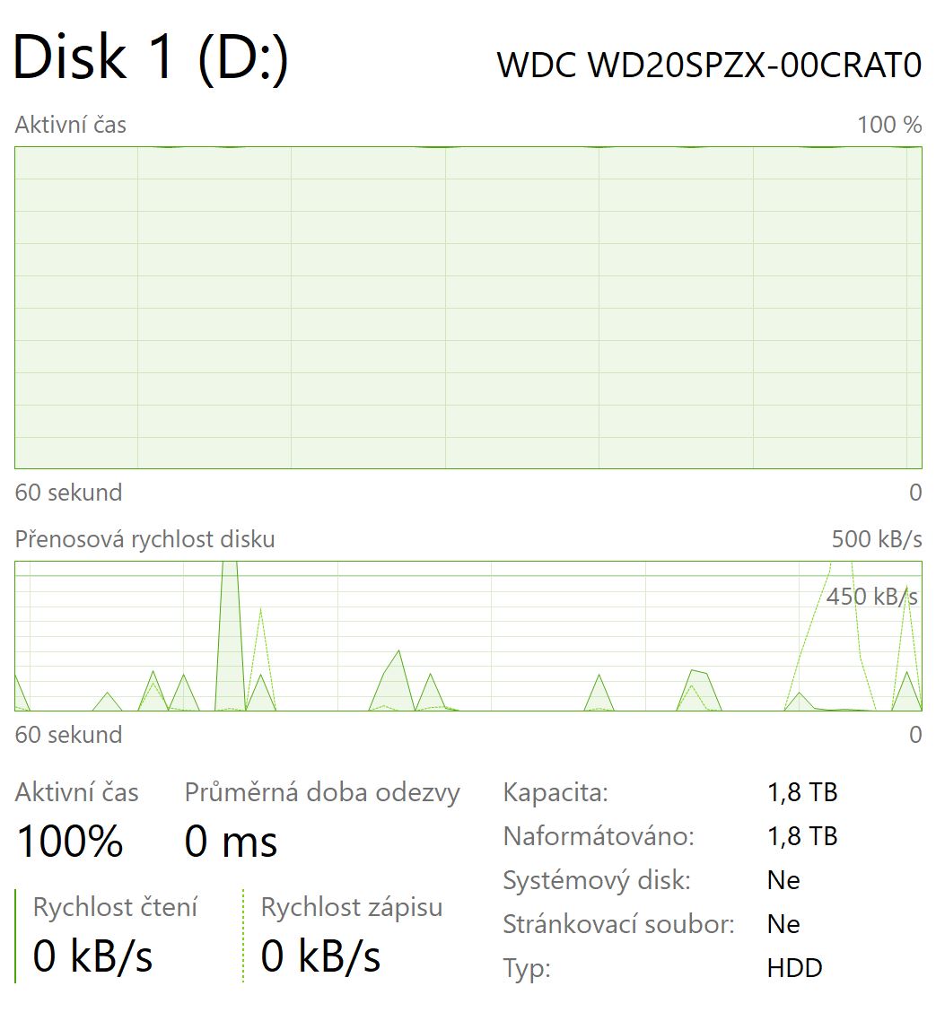 HDD se dnes strašně zpomalil, nejde přehrát video bez sekání, načítání fotek trvá občas věčnost, ESET při kontrole čeká na jednom 5MB JPEG třeba 10 vteřin nebo déle. Přenosová rychlost ve správci úloh je ve stovkách kb/s: